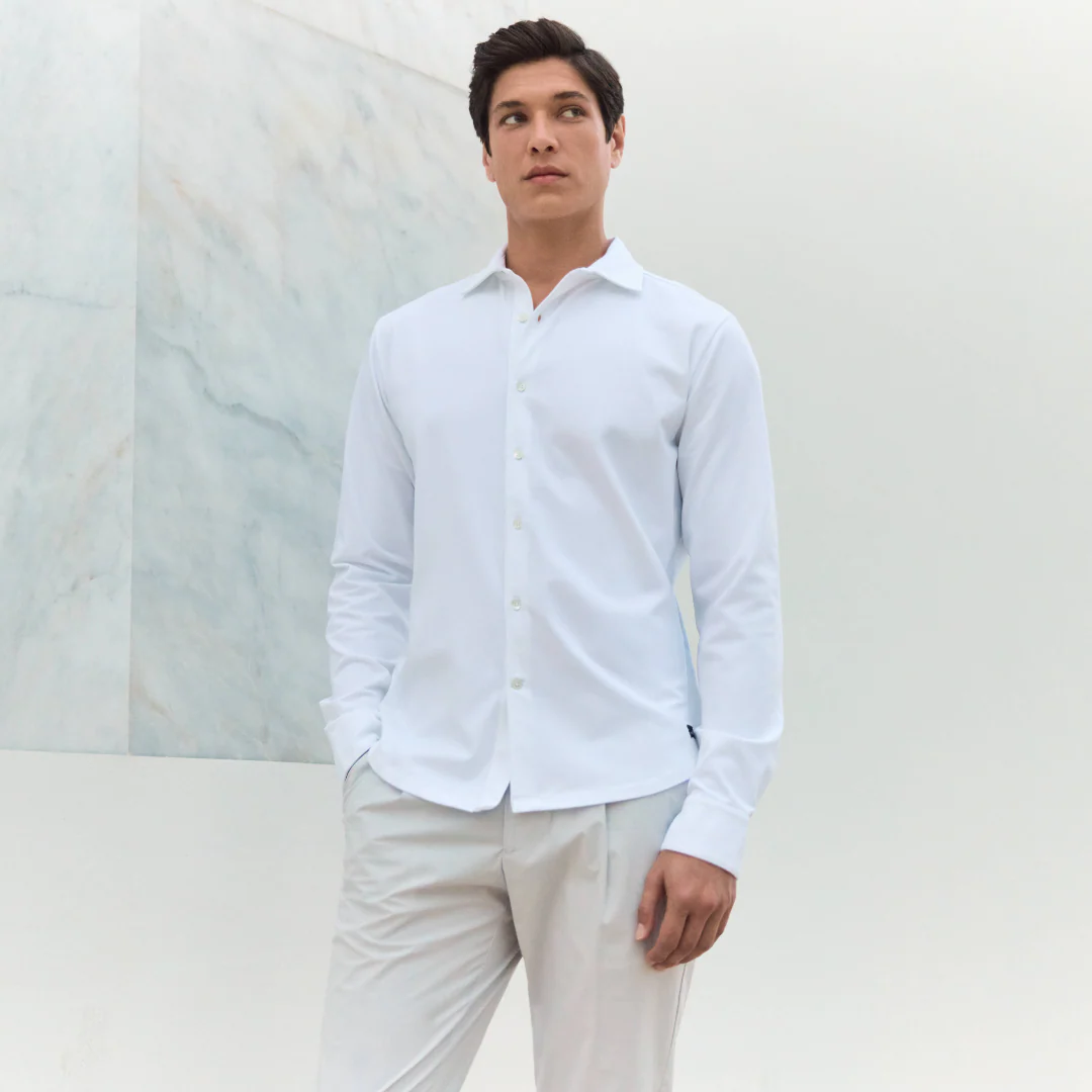 Meet DUKE, our high-comfort shirt is cut from soft organic cotton with added stretch and tailored for a modern fit. The dress-shirt collar and real mother-of-pearl buttons are subtle details that reflect our uncompromising standards.