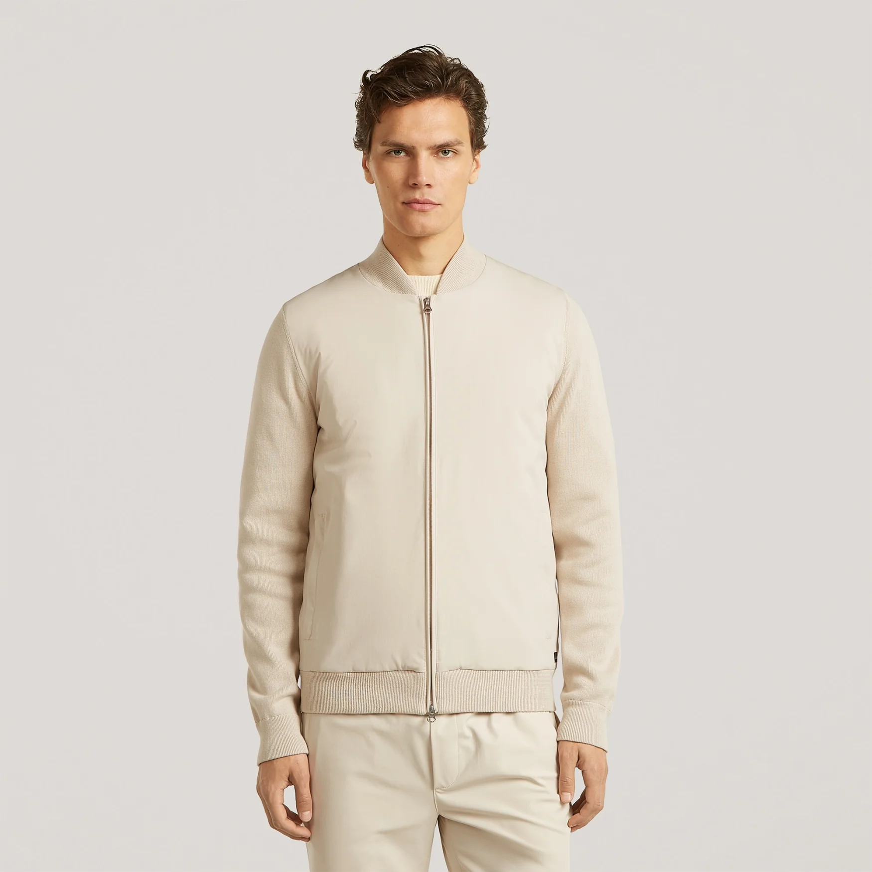 This new hybrid bomber jacket is designed for life on the move. Its technical front with water-repellent features adds functionality to the knitted combed cotton body. Two zipped front pockets with hidden zips add both style and practicality, giving you secure storage without compromising the clean design. This jacket is not only super comfortable – its sleek design also provides a sporty chic look for work, travel, and play.