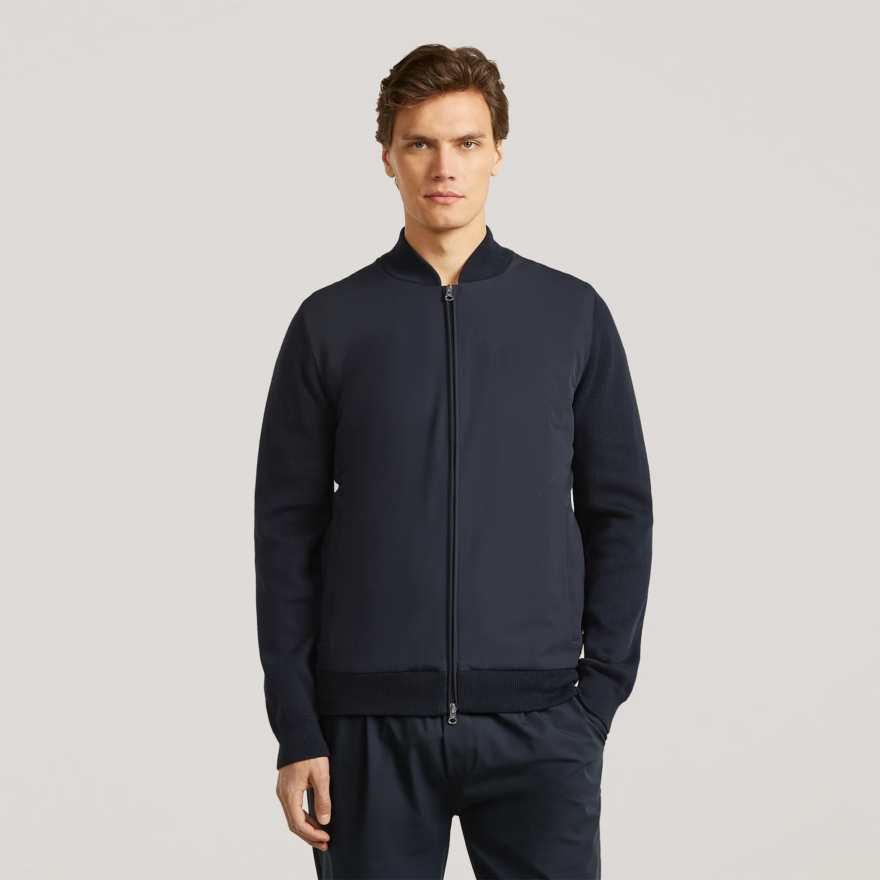 This new hybrid bomber jacket is designed for life on the move. Its technical front with water-repellent features adds functionality to the knitted combed cotton body. Two zipped front pockets with hidden zips add both style and practicality, giving you secure storage without compromising the clean design. This jacket is not only super comfortable – its sleek design also provides a sporty chic look for work, travel, and play.