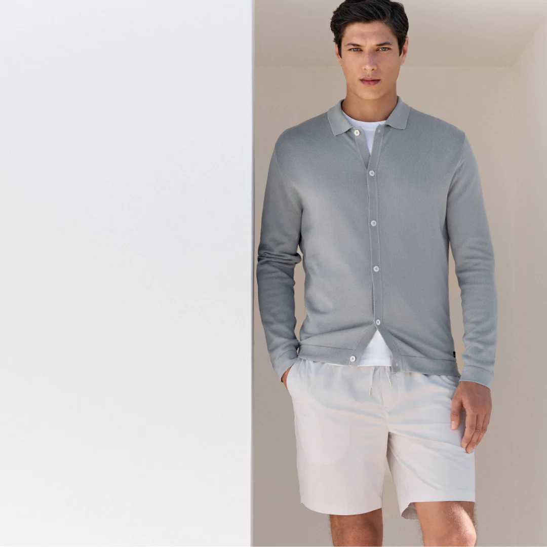 This modern cardigan is crafted from a soft combed cotton and designed with a polo collar. A sophisticated style that offers pure comfort and is easy to match with your favourite smart or casual trousers. The engraved real mother of pearl buttons add a luxurious touch to this effortless style.
